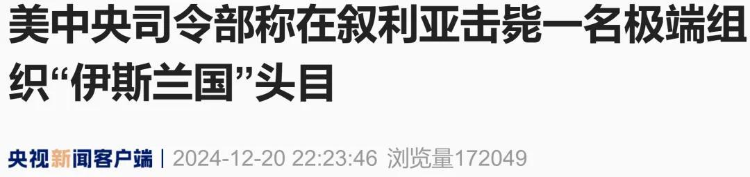 当地时间12月20日,据美国中央司令部在社交媒体平台上发布的一份声明,美国中央司令部部队19日对位于叙利亚代尔祖尔省的极端组织“伊斯兰国”头目阿布·优素福进行了精准袭击,导致包括阿布·优素福在内的共两名“伊斯兰国”成员死亡。
